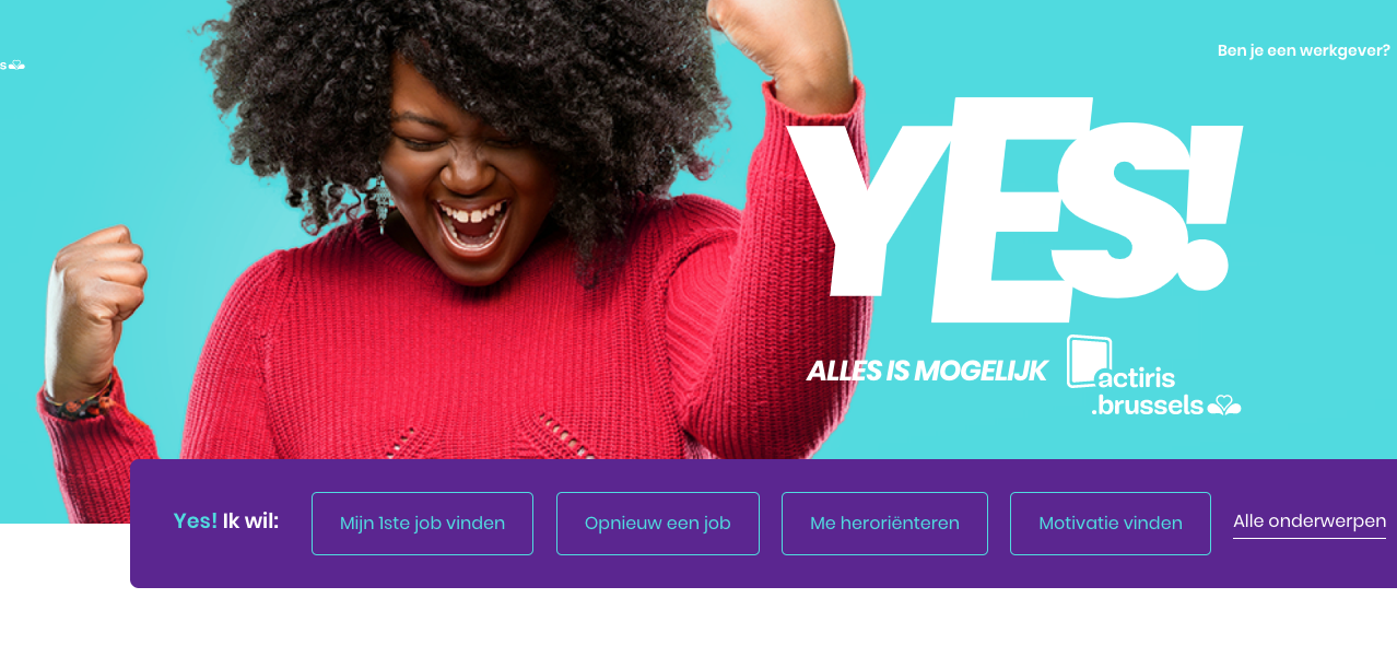 In je kot blijven en toch werk zoeken … in het besef dat de jobs momenteel eerder dun gezaaid zijn! Werkzoekenden hebben het niet gemakkelijk en dat was voor Actiris dan weer een extra stimulans om zijn doelgroep optimaal te ondersteunen. Ruim een jaar geleden startte de werkgelegenheidsdienst de blog YES!, met een opvallende, ultrapositieve branding (“alles is mogelijk”). De uitnodigende content zet lezers aan om met een positieve ingesteldheid in actie te komen, deel te nemen aan programma’s en het verleden achter zich te laten.